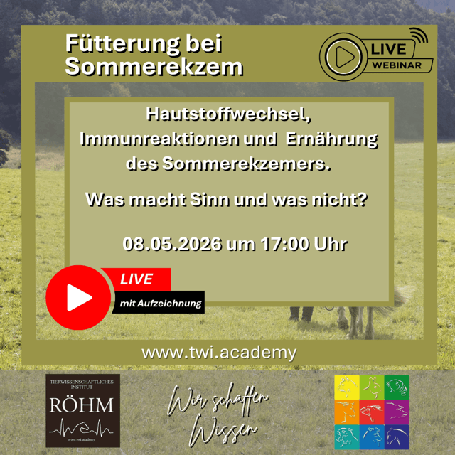 Haldenhof, Dußlingen Haldenhof 1, Dußlingen, DeutschlandConny Röhm ist studierte Pferdewissenschaftlerin, Autorin und Dozentin. Sie gehört zu den bekanntesten Expertinnen im Bereich Pferdefütterung und betreibt das Tierwissenschaftliche Institut mit hochwertigen Fortbildungen. Adipositas beim Pferd ist ein wichtiges Thema, da sie schwerwiegende gesundheitliche Folgen haben kann. 19.06.2026: 18-21 Uhr Freitag: ausführliche Behandlung von Stoffwechselerkrankungen wie Hufrehe und EMS 20.06.2026 10-17 Uhr Samstag...