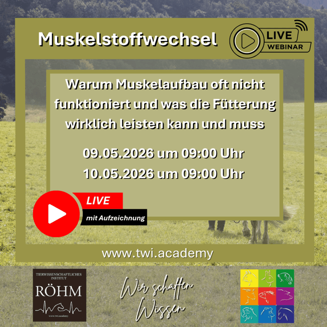 Muskelstoffwechsel beim Pferd – warum Muskelaufbau oft nicht funktioniert und was die Fütterung wirklich leisten muss Probleme im Muskelaufbau gehören zu den häufigsten Herausforderungen in der Pferdehaltung. Pferde bleiben trotz Training schwach bemuskelt, bauen schnell wieder ab, zeigen mangelnde Leistungsfähigkeit, Trainingsintoleranz oder reagieren empfindlich auf Belastung. In vielen Fällen wird die Ursache nur im Training...